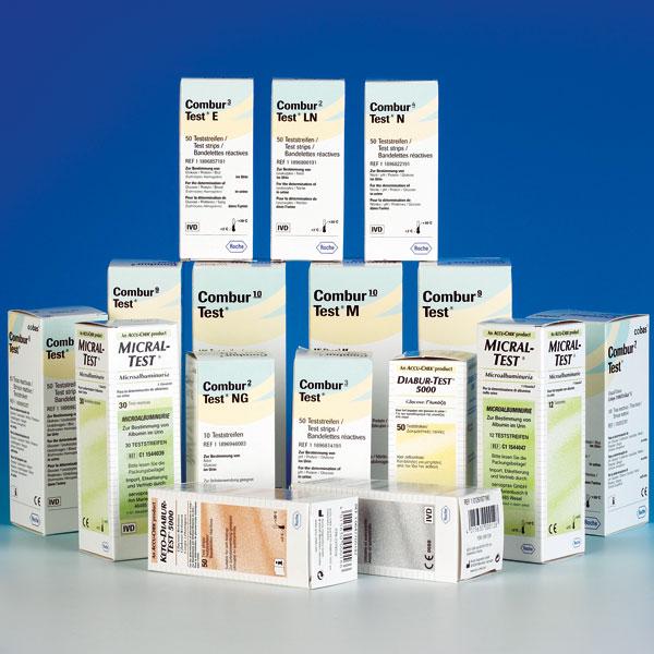 Urine teststrips, Combur 3, Roche Glucose, Eiwit en pH Artikelnummer: 0230125 Besteleenheid doos (50 Stuks) Vraag offerte aan